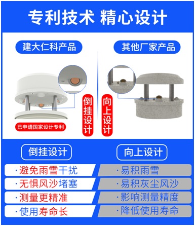 1、山東仁科超聲波風速風向傳感器采用倒掛設計,可避免雨雪干擾、無懼風沙堵塞,相比市面上無倒掛設計的產(chǎn)品,測量更加的精確,使用壽命更長。此技術已申請國家專利。